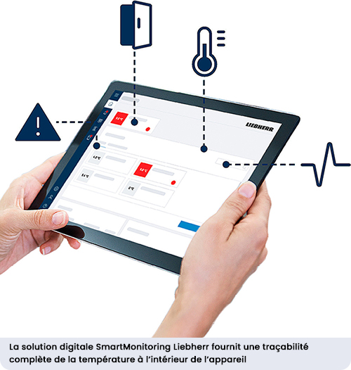La sécurité constitue le quatrième axe clé de l’engagement LIEBHERR. Les équipements de la gamme Laboratoire intègrent tous en standard trois niveaux d’alarme : température haute/basse, ouverture de porte et coupure de courant, avec alertes visuelles et sonores. Toutes les armoires sont en outre équipées de relais d’alarmes (contact sec) pour leur connexion à une centrale de surveillance à distance.